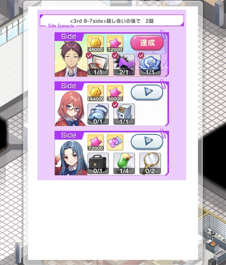 | 3話 | ![]() ![]() 制服3、学食3 報酬:ポイント400、経験値100 ![]() ![]() ![]() 娯楽施設6,1,3 報酬:経験値600、ダイヤガチャチケット ![]() 本2 報酬:ポイント800、経験値200 |